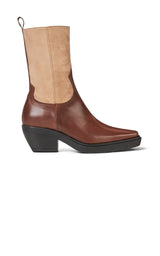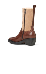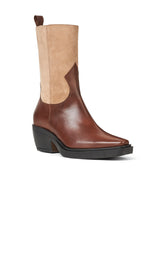 De brune cowboystøvler i læder og ruskind kombinerer den klassiske westernstil med en varm og rustik farvepalet, der er perfekt til ethvert udendørseventyr.