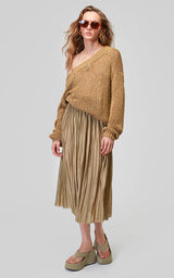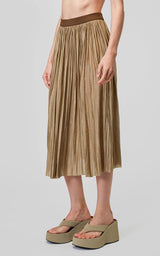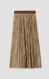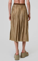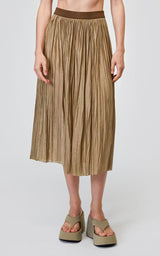 Den smukke og altid populære nederdel fra Roberto Collina er tilbage i en militærgrøn. Denne plisserede midi-nederdel er lavet af polyester og har en laserskåret søm for en sømløs finish. Da den er vendbar, giver den maksimal alsidighed og en række forskellige stylingmuligheder. Billedet viser den ene side af nederdelen, som er den mest klassiske og diskrete - på den anden side er nederdelen i samme farve, men med mere metalliske tråde, hvilket giver den et mere skinnende og festligt udtryk.