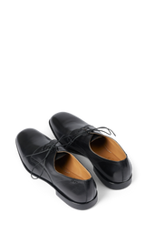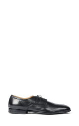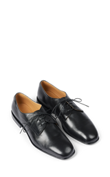 Flotte klassiske sko i sort glat skind, med tre snørehuller og en firkantet snude. Skoene er super lette og lavet i det blødeste skind. De har skind såler med forfod i let gummi.