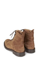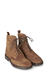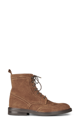 Cool snørestøvler i brun/cognac ruskind med golf-mønster både på snuden og op af siderne. Støvlerne har fem snørehuller og to hægter øverst og sorte gummisåler.