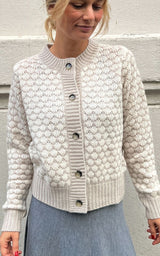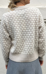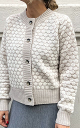 Smukkeste cardigan med et muslingeskals-mønster i beige/lysegrå og hvid. Lavet i en fantastisk blød og lækker blanding af uld og cashmere.