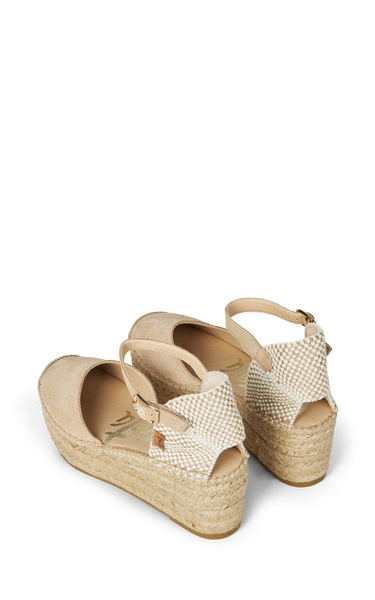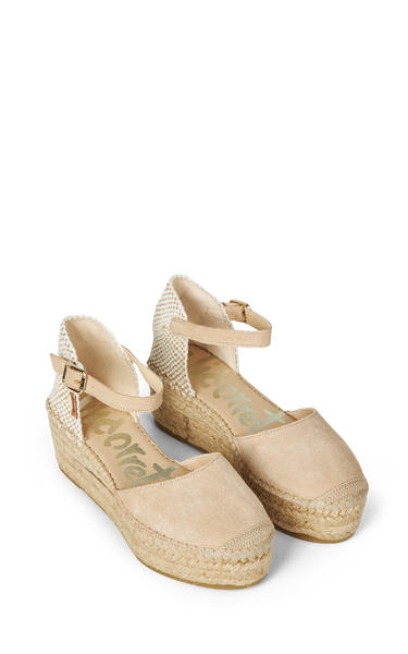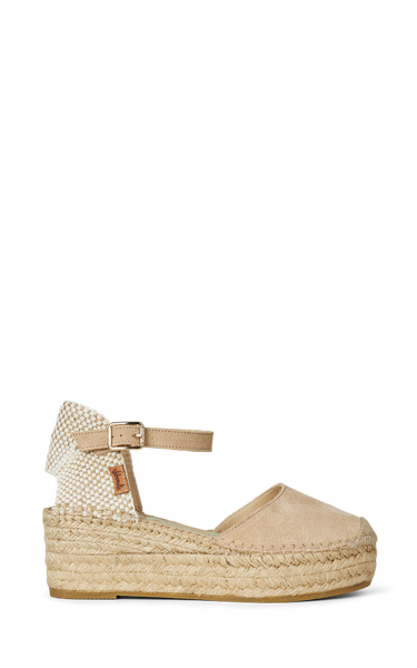 Smukke espadrilles med kilehæl i sand ruskind. De har en 6 cm hæl og med en justerbar ankelrem. Håndlavet i 100% naturlige og økologiske materiale såsom jute reb, der gør det muligt for Vidorreta sko at tilpasse sig fødderne.
