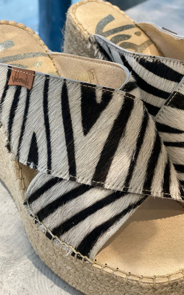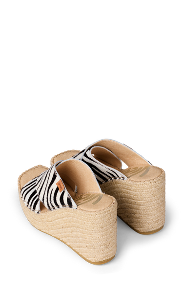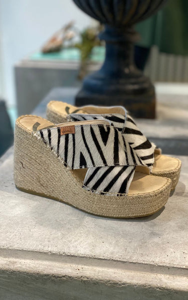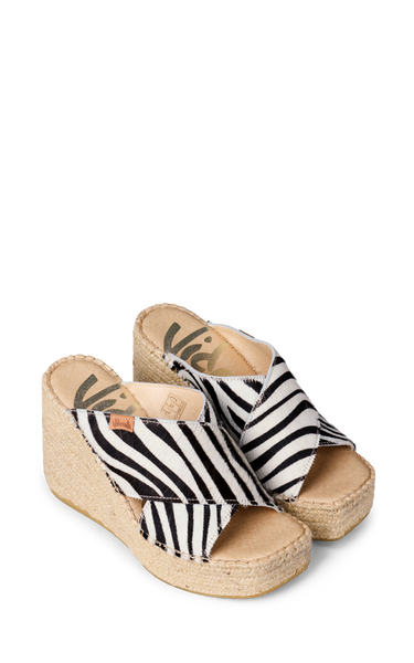 Høje sandaler fra spanske Vidoretta. Sandalerne har zebra printet, ponyhair remme over vristen og læder indersål samt plateausål af jute.