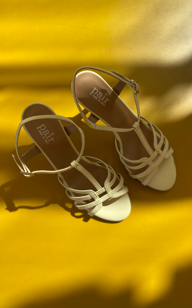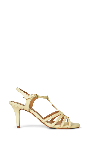 En smøgul elegant sandal med hæle til kvinder. Skoen er et delikat design med tynde stropper, der skaber et krydsmønster over foden. En tynd ankelrem med et lille spænde sikrer skoen. Hælen er en slank stilettype. Den bløde gule farve tilføjer et strejf af friskhed og lethed, og dens enkelhed gør den til et alsidigt valg. Vores "dance" model er en klassiker, der er kendt for de fantastisk bløde såler.