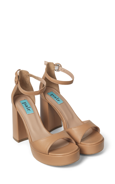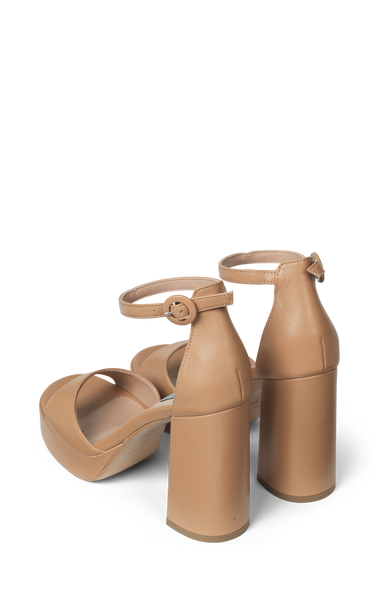 Smukke høje sandaler i lys beige med chunky hæl og plateau. De er har 10 cm. hæl, ankelrem og en 2,5 cm. plateau.