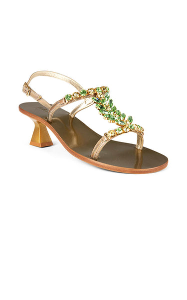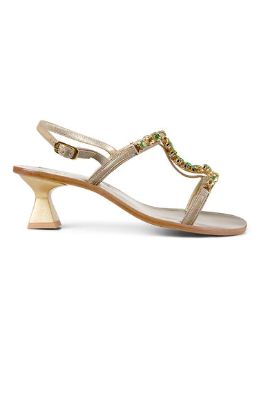 Smukke og skinnede sandaler med grønne og beige farvede sten der danner en fin blad form midt på foden. Sandalerne har en guld 6 cm. hæl.