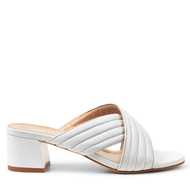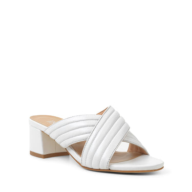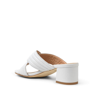 Smuk og behagelig cross-slip sandal i hvidt læder. Blok halvhøj hæl, perfekt til de lange sommeraftener.