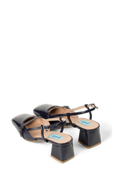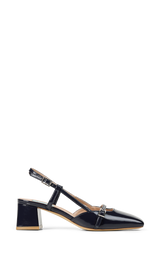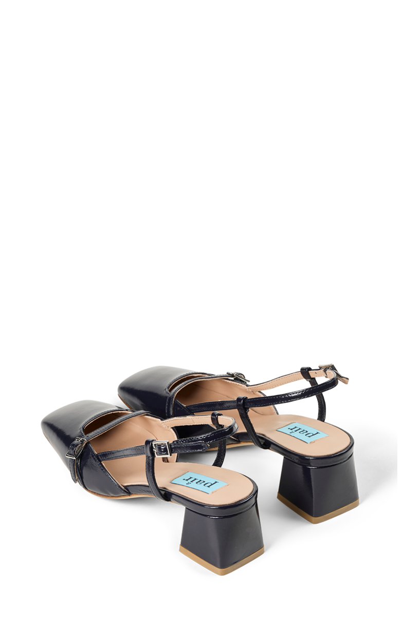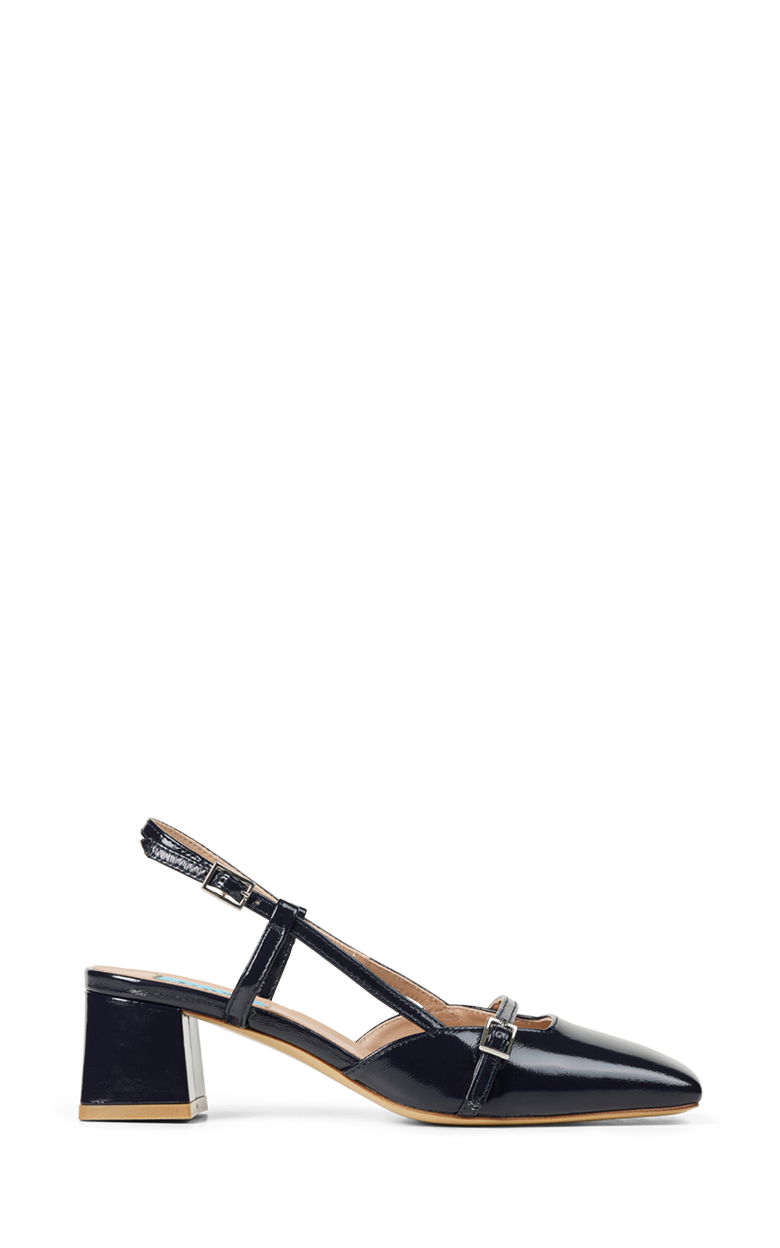 Elegant slingback i mørk navy blankt læder med firkantet snude og feminine remdetaljer. Den stabile blokhæl og de fine stropper giver et raffineret og moderne udtryk, mens den justerbare hælrem sikrer en komfortabel pasform. En stilfuld sko der passer perfekt til både arbejde og elegante hverdagslooks.