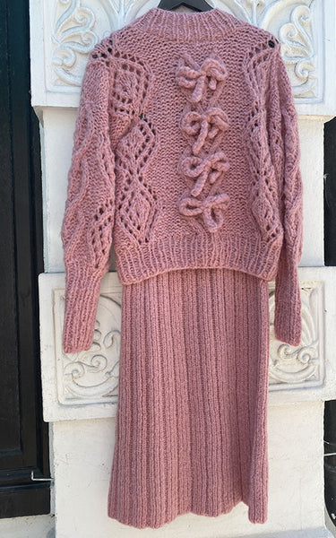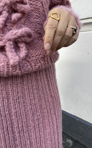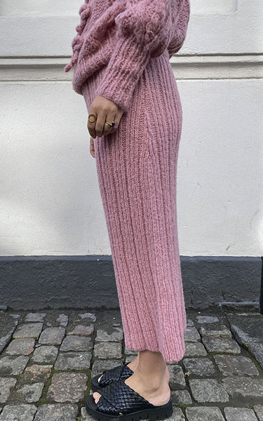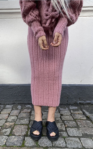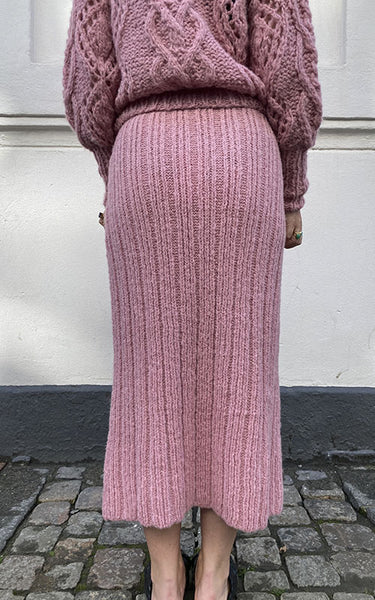 Håndstrikket støvet pink nederdel, med smukke brede strikkede detaljer og elastik i taljen. Perfekt til en farverig pop til efteråret. Style med den matchende sweater.