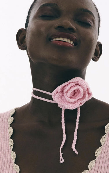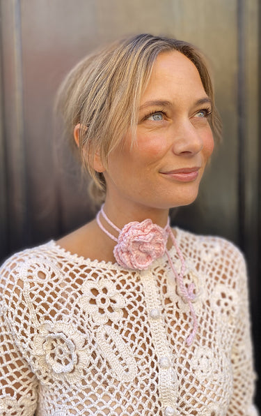 Smuk hæklet choker med blomsterdetalje i lys pink.