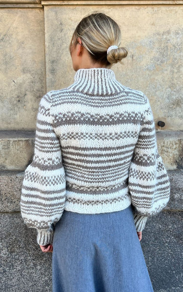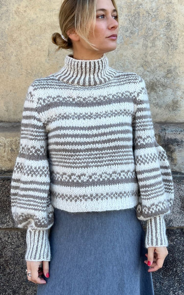 Smuk højhalset strik med puffy ærmer i ivory og blå. Perfekt til både at holde sig varm og elegant i det kolde vejr!