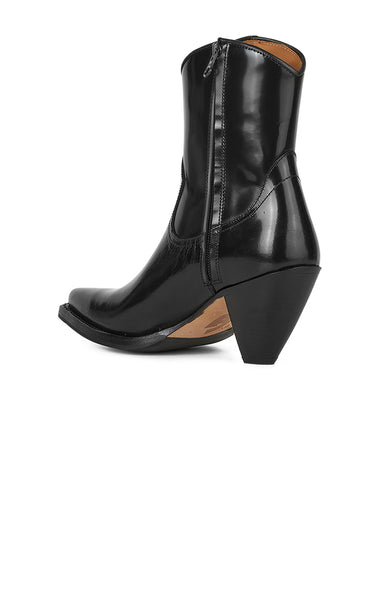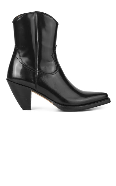 Flotte og seje cowboystøvler i sort læder. De har enkle fine sydetaljer, spids tå og skaftet går ned i et V foran og bagpå.