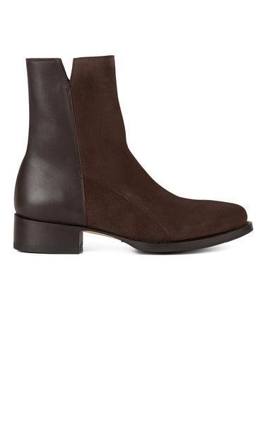 Skønne klassisk flade støvler i brun ruskind på fronten og glat brun skind på bagsiden. De har lynlås på siden og en 4 cm. hæl.