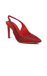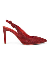 Smukke håndlavede stiletter fra Fauzian Jeunesse. Det bløde flettede læder er farvet i en fantastisk rød farve, skoene har en sling back med et spænde, en spids snude og en 9 cm. hæl.
