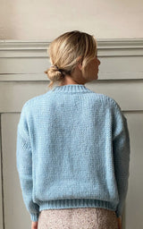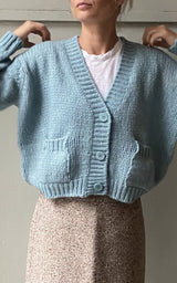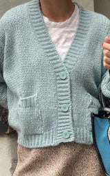Lækker cardigan fra italienske Roberto Collina. V-hals udskæring, lommer og knappe lukning. Strikken er en smuk støvet blå farve.