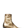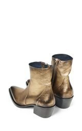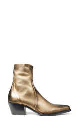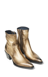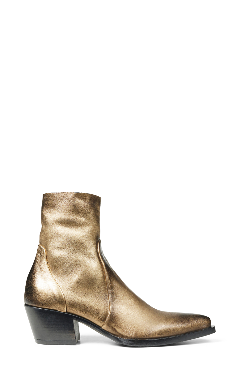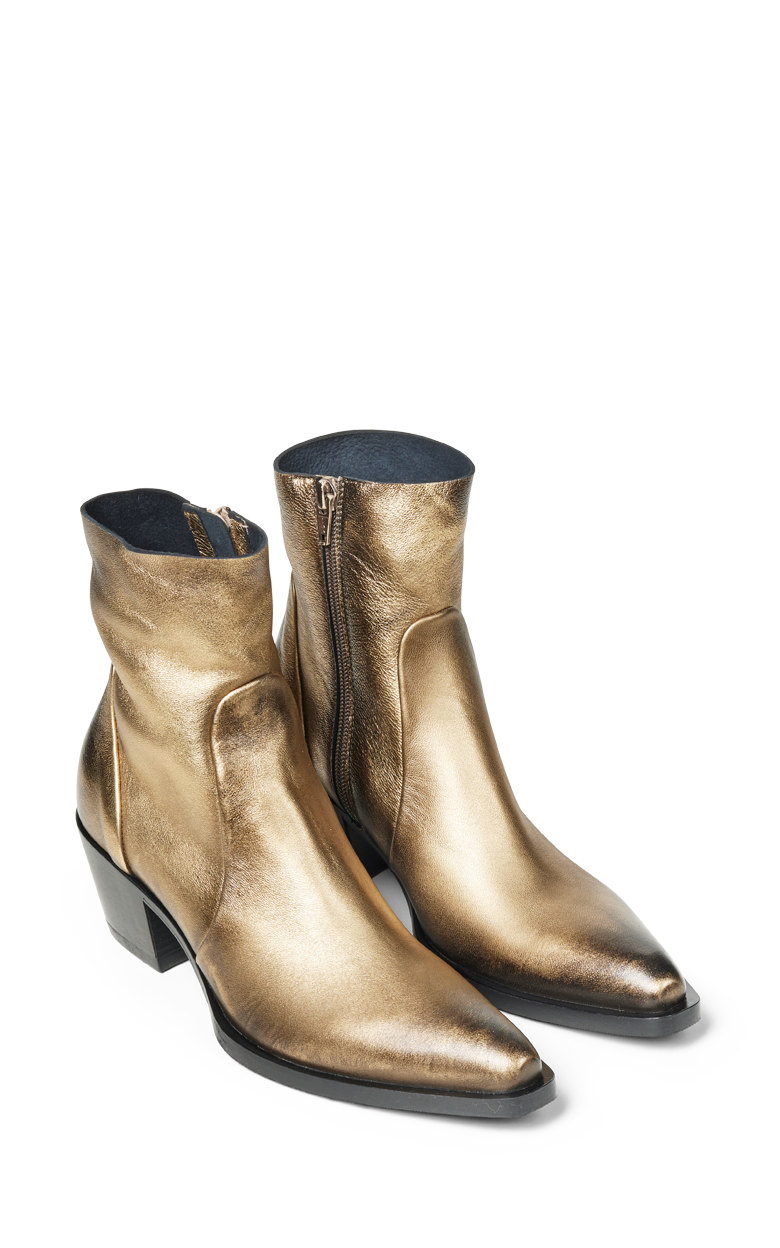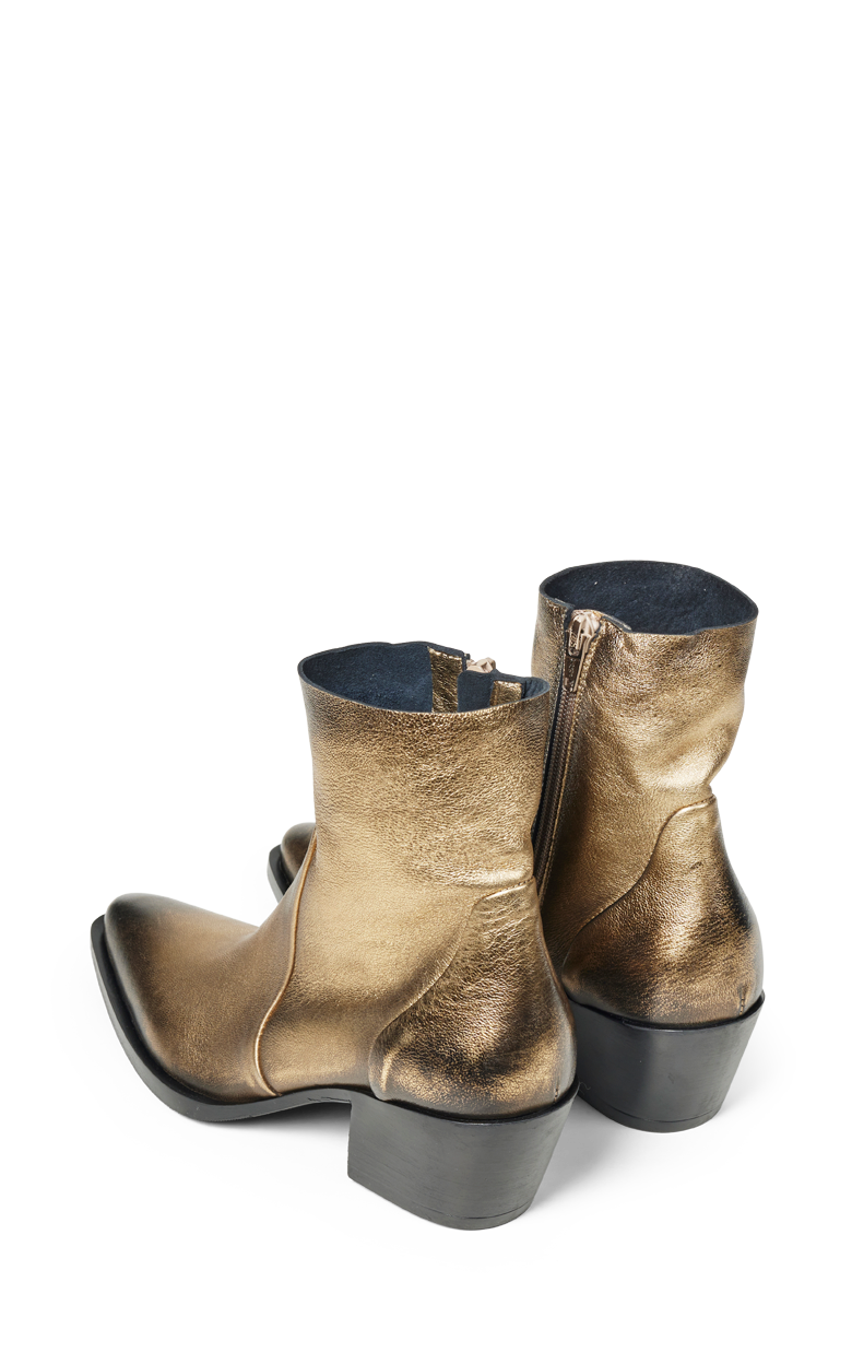 Eksklusive ankelstøvler fra Elena Iachi i metallisk gyldent læder. Det bløde skind har et smukt, levende shine, der giver støvlen et markant og luksuriøst udtryk. Den spidse snude og den skulpturelle western-inspirerede hæl skaber en moderne silhuet med kant og elegance. Et iøjnefaldende design, der kombinerer italiensk modefornemmelse med håndværksmæssig finesse.