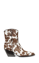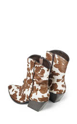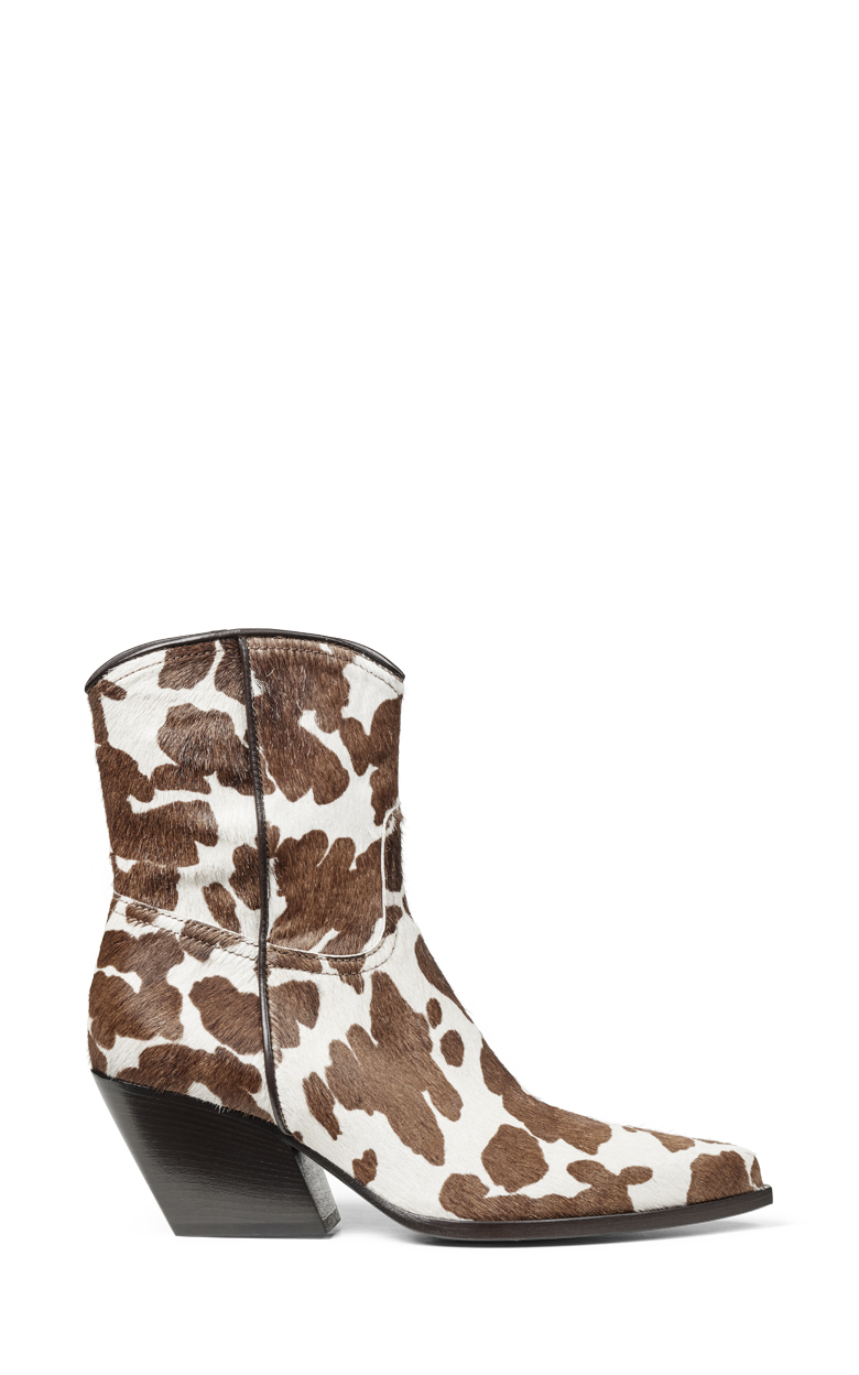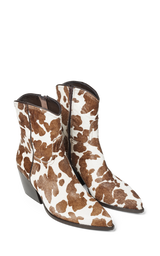 Smukke western-inspirerede støvler i cow-print ponyskind. De er fremstillet i ægte læder, som giver hvert par et unikt og karakterfuldt udtryk. Støvlerne har en spids snude og en 7 cm skulpturel hæl, der kombinerer moderne attitude med klassisk håndværk.