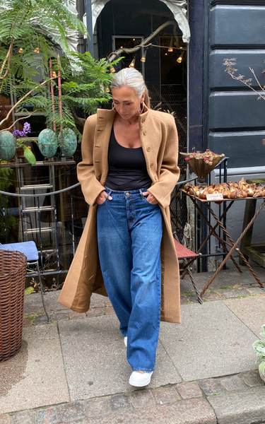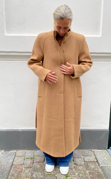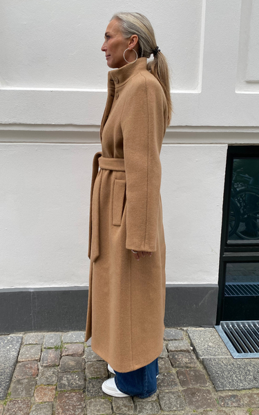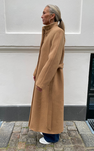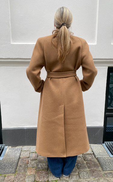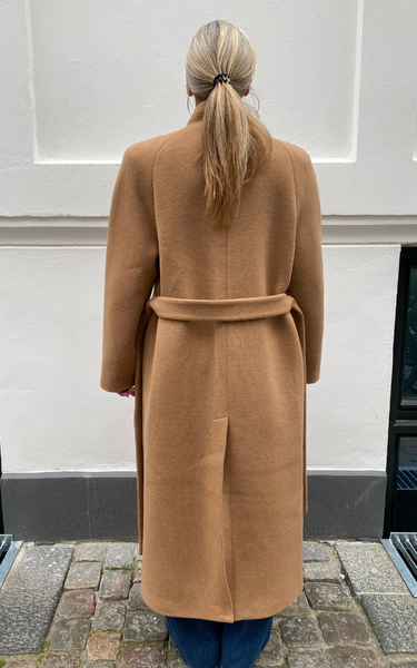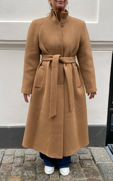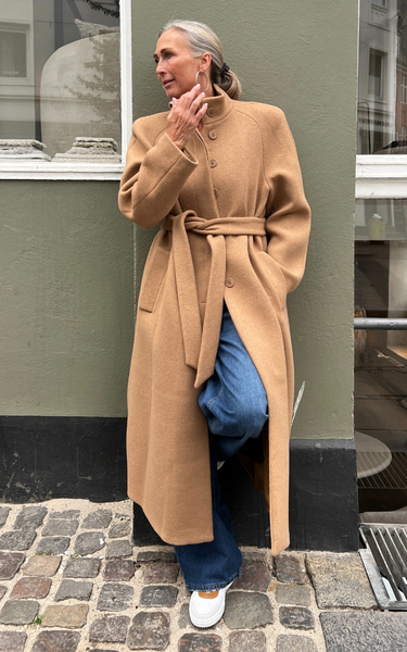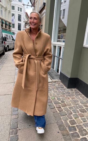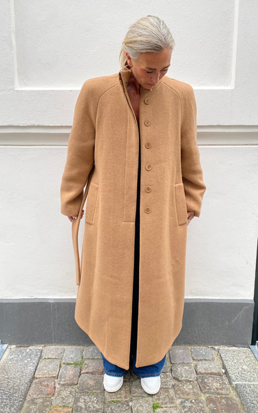 Den smukkeste frakke i camel farvet uld. Frakken har et cool oversize look, med skulderpuder og bindbånd til taljen. Perfekt til et klassisk efterårslook med et et cool twist.