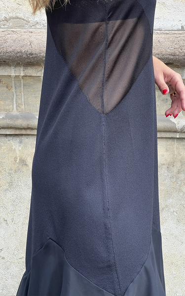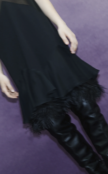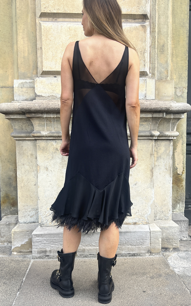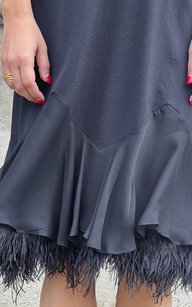 Smuk sort kjole med fjer. Kjolen har V-udskæring på front og ryg, gennemsigtige detaljer, vid nederdel i georgette med fjer, figursyet pasform og er knælængde.