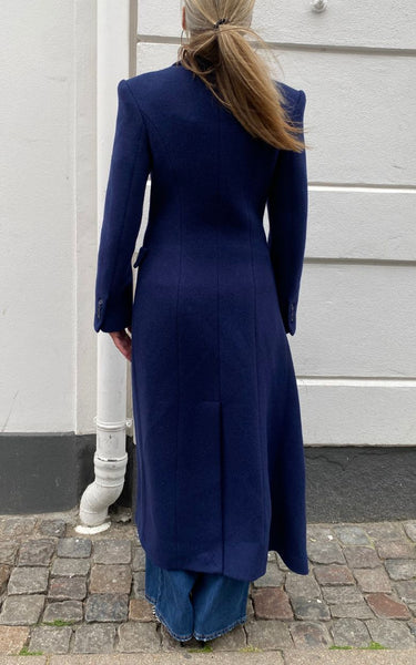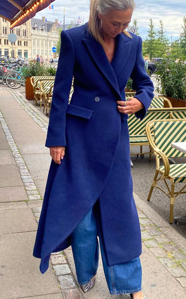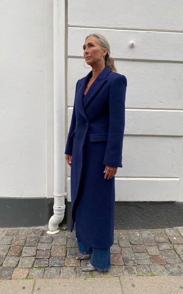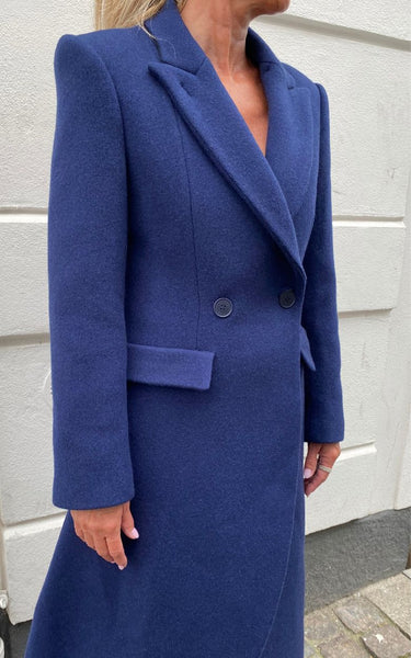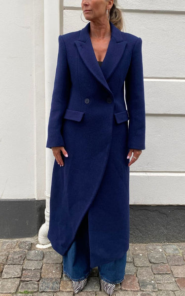 Elegant og tidløs lang blazerfrakke i en dyb navyblå nuance. Frakken er designet med skarpe skuldre, bred revers og dobbeltradet lukning, der giver et sofistikeret og moderne udtryk. De to frontlommer med klap understreger det klassiske snit, mens den lange silhuet skaber en flatterende og stilren form.