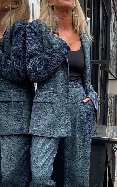 Cirus Hotel – Jacquard Blazer. En statement-blazer med et eksklusivt twist. Denne blazer er skabt i et struktureret jacquardvævet materiale med et grafisk, bladlignende mønster i dybe blå og grønne nuancer. Den har et oversized, boxy snit med brede skuldre og lange ærmer, hvilket giver et cool, afslappet udtryk. Foran har den klassiske revers og klaplommer, som understreger det elegante design.