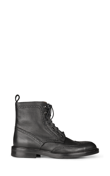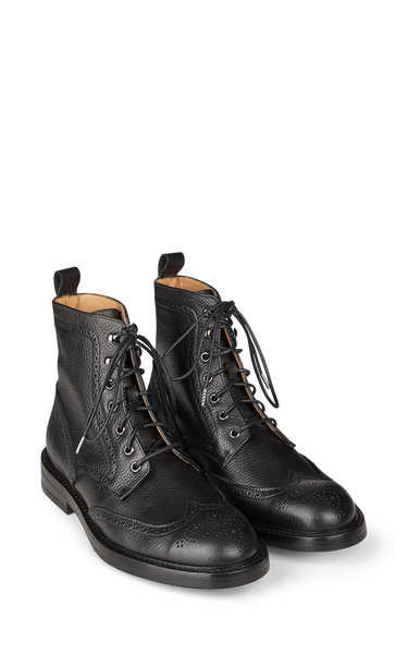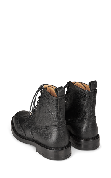 Cool snørestøvler i sort læder med golf-mønster både på snuden og op af siderne. Støvlerne har fem snørehuller og to hægter øverst og gummisåler.