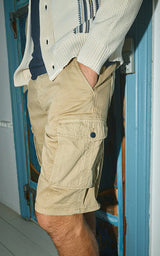 En løstsiddende cargo-shorts lavet af et komfortabelt satin-bomuldsstof i militærbomuld og med ripstop-bæltestropper og sidelommer. De har knaplukning og flagnitte på højre frontlomme.