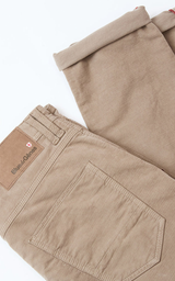 Funktionelle detaljer omfatter skrå forlommer, klassisk knapgylp og forstærkede, foret baglommer for ekstra styrke. En diskret Blue de Gênes-flag-nitte ved forlommen giver det sidste touch—et underspillet nik til håndværk og identitet.