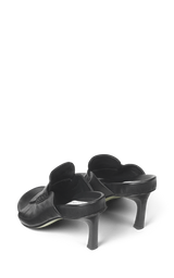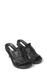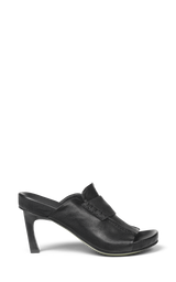 Cool skulpturelle høje slip-in's i sort skind. De har en bred afrundet snude og et bælte over foden og en smal 7 cm. hæl.