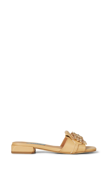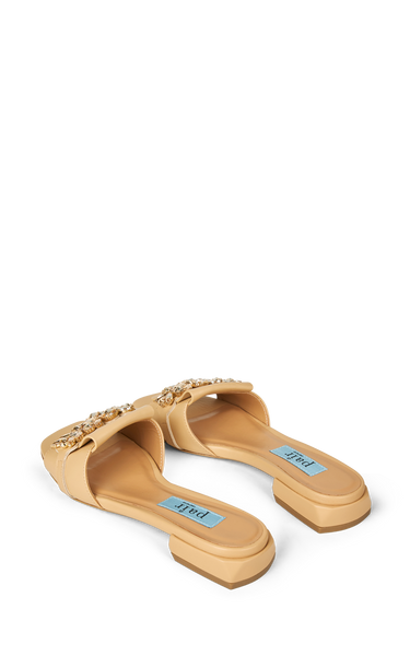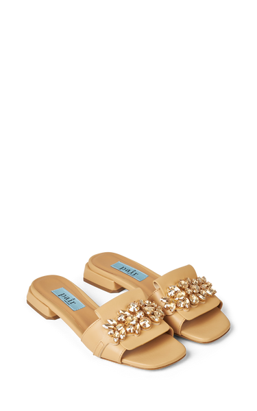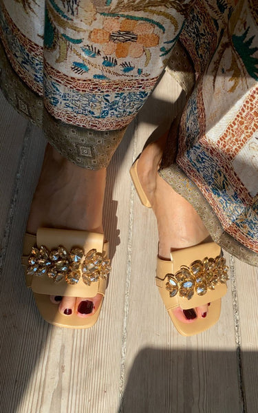 Smukke slip in sandaler i beige læder til kvinder.  Skoene er et enkelt, diskret design med en firkantet tå og en lille firkantet hæl.  Sandalen er pyntet med en klynge af lyse champagnefarvede rhinsten. Sandalen har lækre bløde indersåler og er  velegnet til både afslappede og formelle lejligheder.