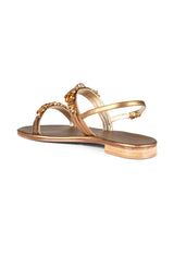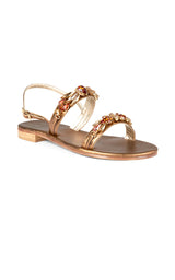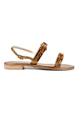 Smukke og skinnende sandaler med bronze farvede skind såler og remme - og med brune og cremefarvede sten på remmene.