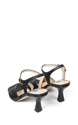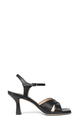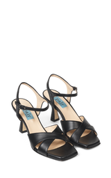 Smukke høje sorte sandaler med kryds-rem og en ankelrem. De har en firkantet tå og en 7,5 cm hæl.