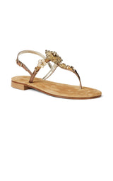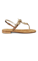 Smukke sandaler med brune ruskindssåler, bronze remme og guld blomster med brune sten på remmen.