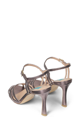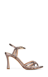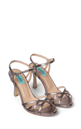 Smuk og festlig høj stilet/sandal. De er lavet i smukt metalisk skind og har smalle krydsende remme på forfoden og en fin ankelrem med lille spænde.