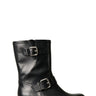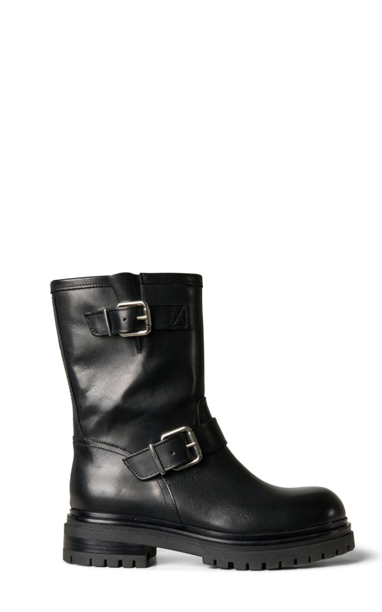 Vores skønne klassiske bikerstøvler i sort glatskind og med sølv spænder. De har lynlås på indersiden og to spænder på ydersiden, medi chunky gummisåler og en skaftlængde på ca. 22 cm.