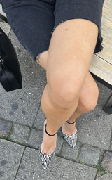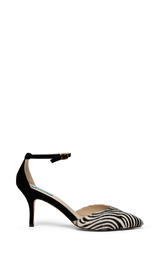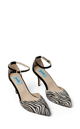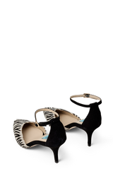 Super smukke og cool stiletter lavet i sort ruskind og ponyhår med zebraprint. De har en spids snude og ligeldes en spids udskæring på fronten, en justerbar ankelrem og en 7 cm hæl.