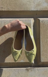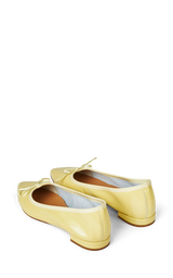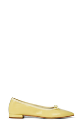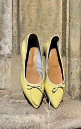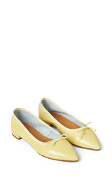 Fin ballerina i den smukkeste lys gule farve i lakeret læder. Skoen har spids snude, lille blok hæl og er detaljeret med en fin sløjfe.