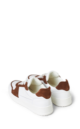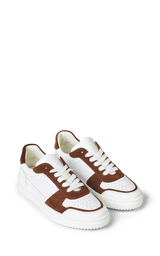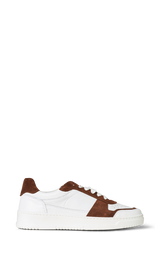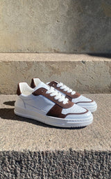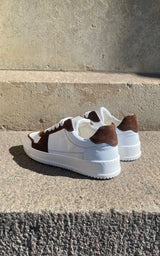 Cool sneakers i en kombination af mørkebrun ruskind og hvidt kalveskind. Hvide snørebånd, hvide gummisåler samt bløde læder inder såler.