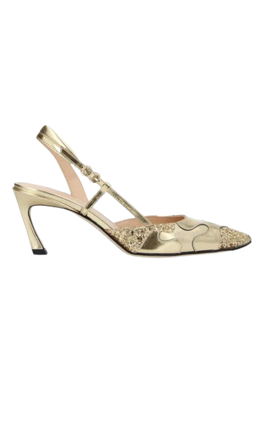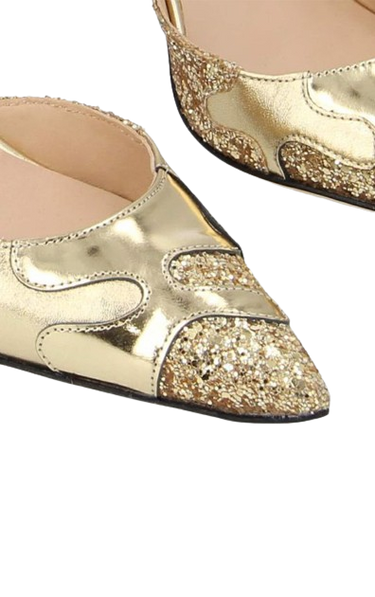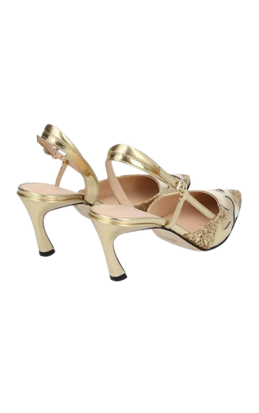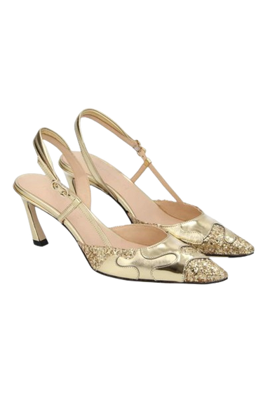 De ultra-elegante Fredas vil tage din stil til et helt nyt niveau. Disse gyldne slingbacks slanke linjer og spidse tå er den ultimative stilsætning. De er lavet i Frankrig af en smuk kombination af metallisk læder, spejllæder og et glitrende lærred, og de har Free Lance's emblematiske camouflagemønster. Deres diskret polstrede ankelrem er fastgjort med et signaturspænde. De er rundet af med en slank, grafisk hæl til et par slingbacks, der perfekt runder dit festlooks af.