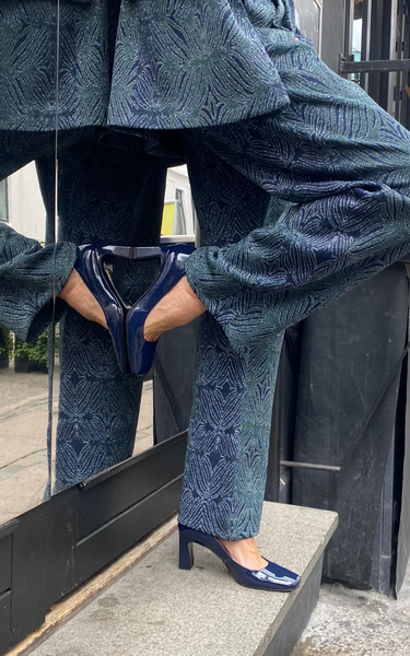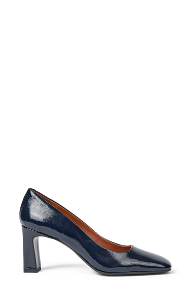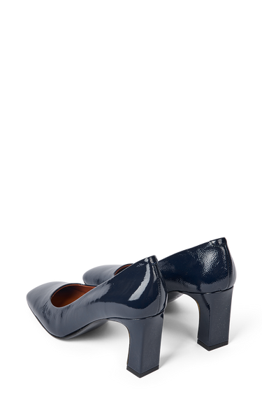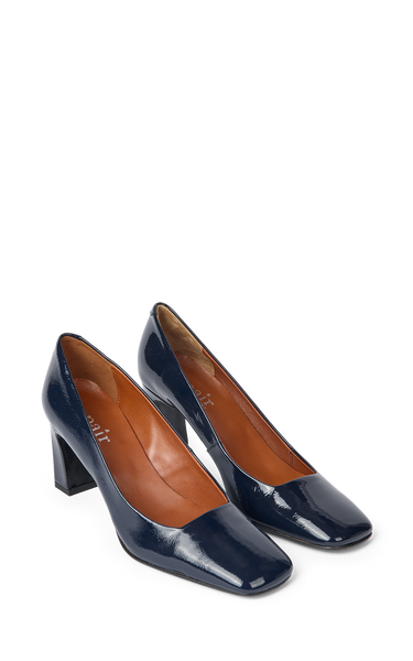 Smukke pumps i navy kalveskindslak. De har en firkantet snude og udskæring - med en firkantet hæl på 7 cm.