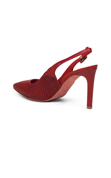 Smukke håndlavede stiletter fra Fauzian Jeunesse. Det bløde flettede læder er farvet i en fantastisk rød farve, skoene har en sling back med et spænde, en spids snude og en 9 cm. hæl.