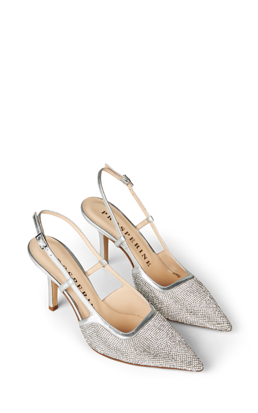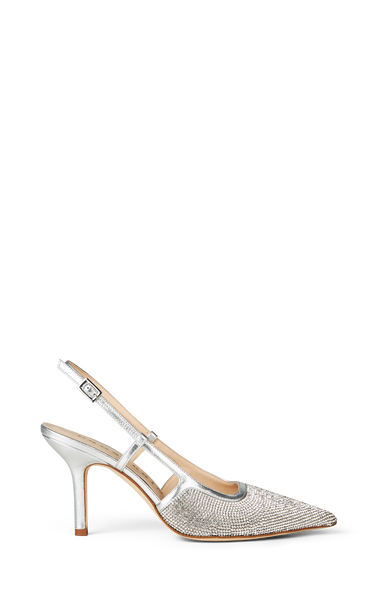Smukke glitrende stiletter med spids snude besat af sølv sten og hæl, slingback og søm i sølv skind. De har en 8 cm hæl og jursterbar slingback.