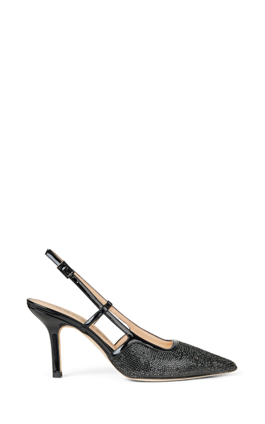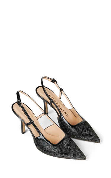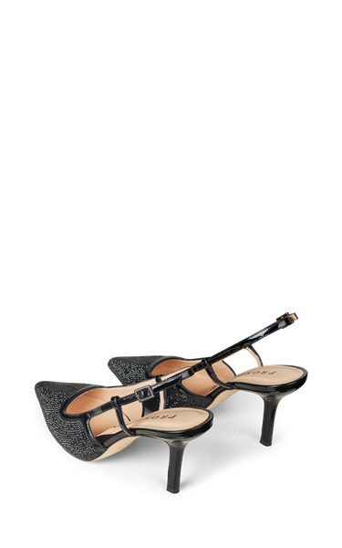 Smukke glitrende stiletter med spids snude besat af sorte sten og hæl, slingback og søm i sort kalveskindslak. De har en 8 cm hæl og jursterbar slingback.