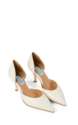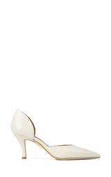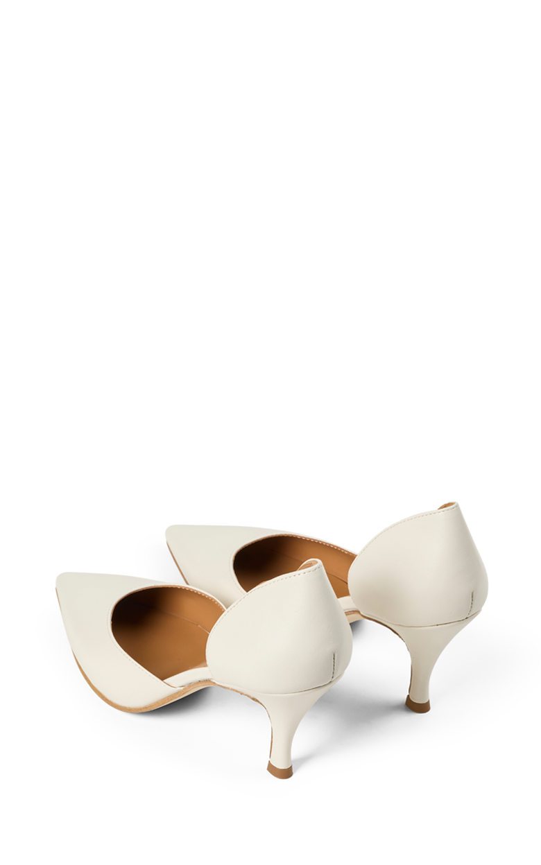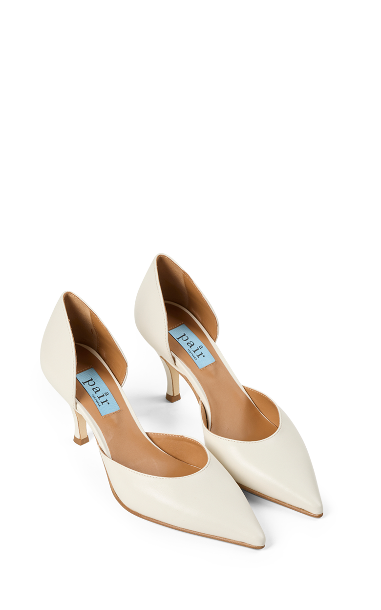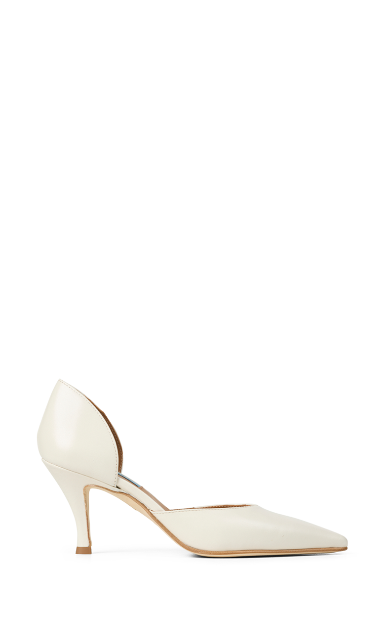 Elegant pump i blødt off-white læder med spids snude og en feminin silhuet. Den åbne side giver et let og raffineret udtryk, mens den slanke hæl tilfører et klassisk og elegant løft. Den lyse farve gør skoen perfekt til både festlige anledninger, sommerens begivenheder og stilfulde hverdagslooks.