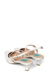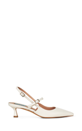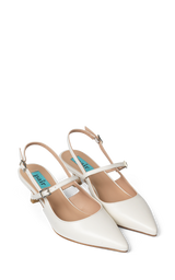 Elegante slingback hæle. Designet til den moderne kvinde, der værdsætter både stil og komfort. Skoene en slank spids tå og en lav kitten-hæl, i en smuk off white farve. Denne slingback har dobbeltremme med justerbare der spænder sikrer en perfekt pasform, mens den lækre læderoverdel giver et eksklusivt og holdbart look. Perfekte til både en klassisk kjole, til suitpants eller som brudesko.