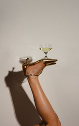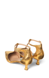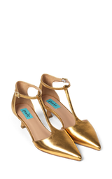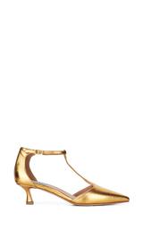 Smukke gold stiletter med en kitten hæl, en rem fra den spidse forfod op til ankelremmen.