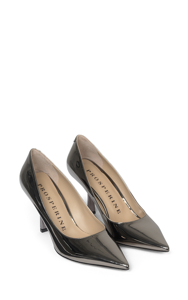 Smukke festlige stiletter i en flot smokey grå lak. Stiletterne har en spids snude og en kantet hæl på 8 cm - hvilket giver dem er ekstra festligt og cool look.