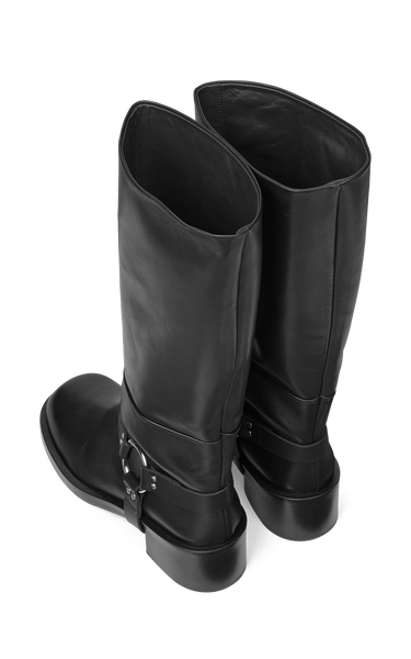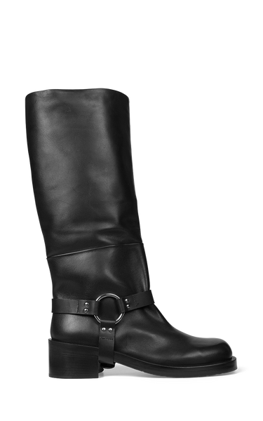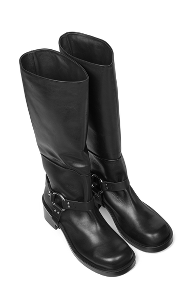 Super cool langskaftede bikerstøvler fra Ernesto Dolani. De er lavet i lækker tyk klaveskind, hvilket giver støvlerne et ekstra cool look og de har en afrundet, men firkantet snude. Sølv ring på begge sider, der holder tre skind remme sammen og danner en form for "sporestykke" og er aftageligt - så støvlen også kan få et helt enkelt udtryk.
