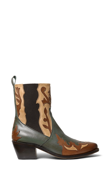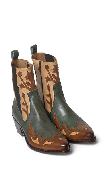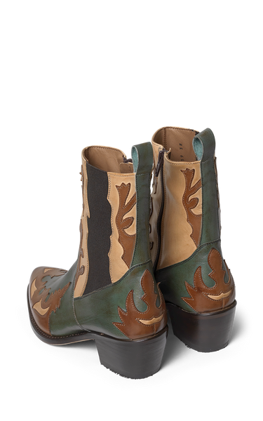 Smukkeste og cool cowboy støvler med det fineste mønster i grøn, brun og lysebrun. Støvlerne har elastik på den ene side og lynlås på den anden. De har en klassiske spids snude og er perfekte som en sej støvle i alle overgangsperioder.