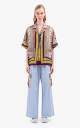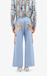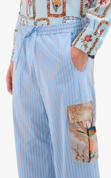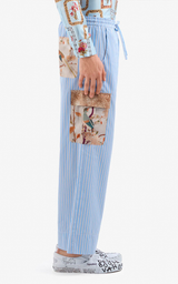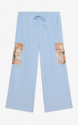 Cool bukser i afslappet pasform og bindebånd i taljen. De har hvide og blå striber og de smukkeste kontrast silke detaljer på to sidelommer og baglommer med fugle og blomster i beige farver.